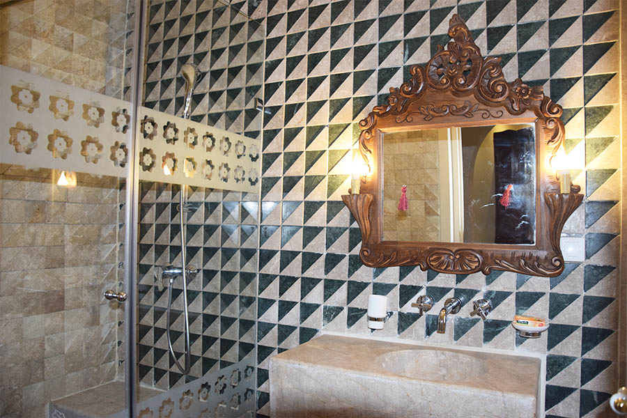 La salle de bain est décorée de marbre Kadhal à motif « Aile d’Hirondelle ». Elle dispose d’une douche Italienne, et de sanitaires haut de gamme.