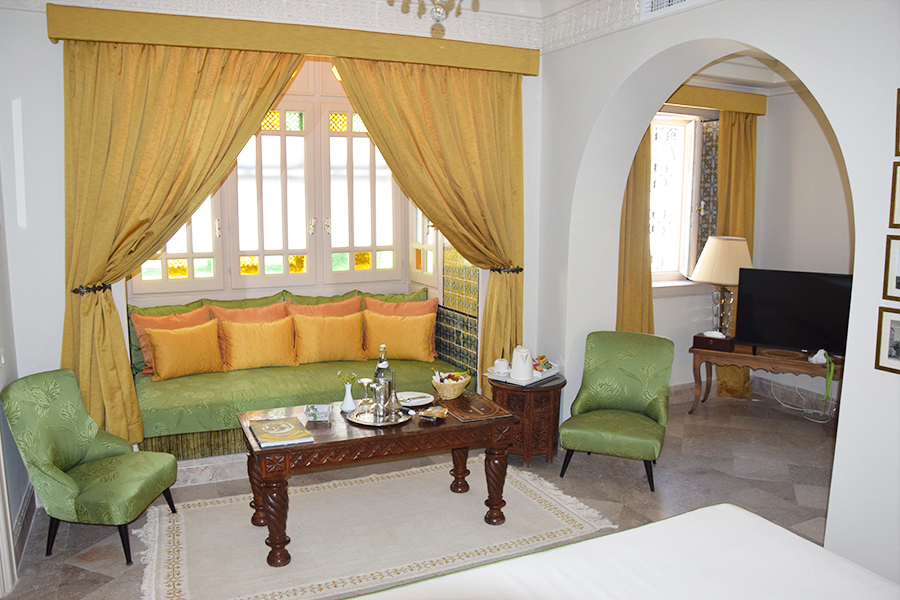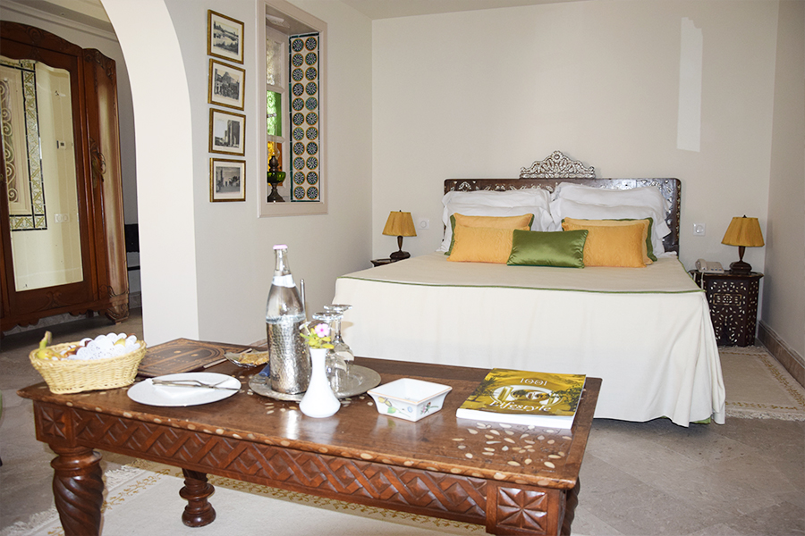 D’une superficie de 40 m² environ, La suite « Néroli » située au 1er étage est équipée d’un lit nacré King Size de 1.80 x 2.00 m, et d’un salon traditionnel « Gannaria » qui donne directement sur la porte « Bab Rayhanna » de la grande mosquée Okba.