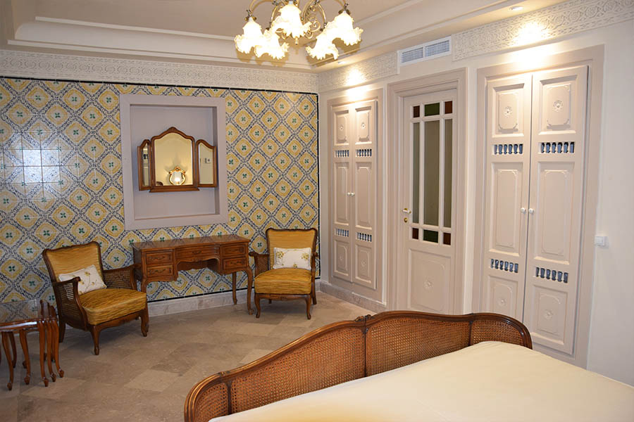 Au premier étage, à gauche d’une galerie finement décorée et sculptée « Hadida », la suite porte le nom évocateur des plaines fleuries de Kairouan notamment le « Nessri ».