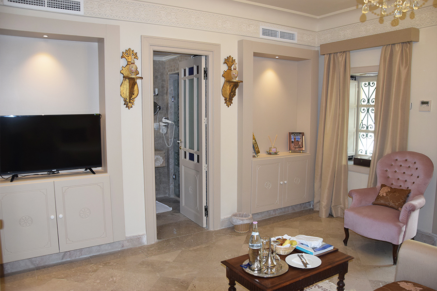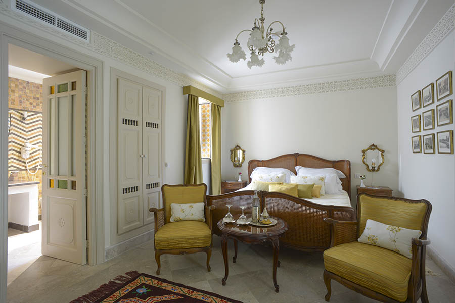 La suite est composée d’un lit double King Size 2.00 x 2.00 m réhaussé d’un « Kouss » artisanal Tunisien et d’un salon de style Art Déco.